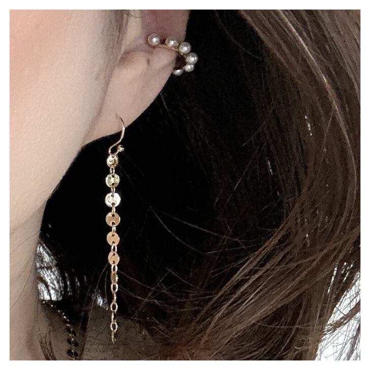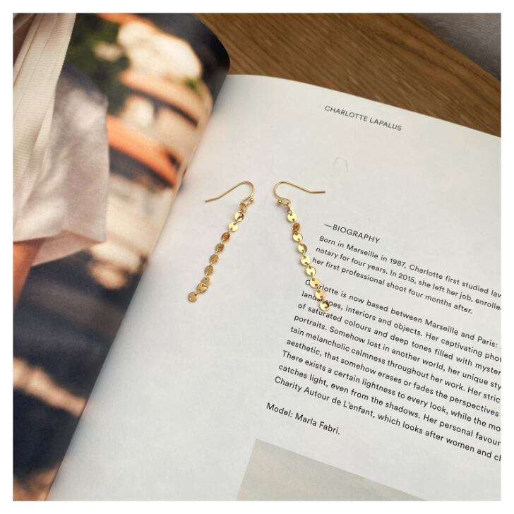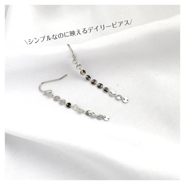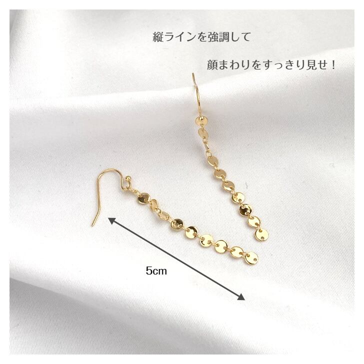 小さなコインを重ねたデザインのチェーンが揺れるたびにきらめきを放つロングピアスです。