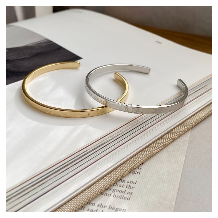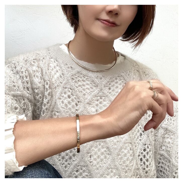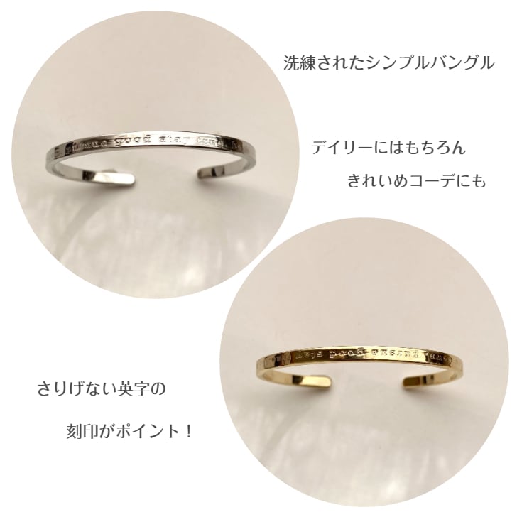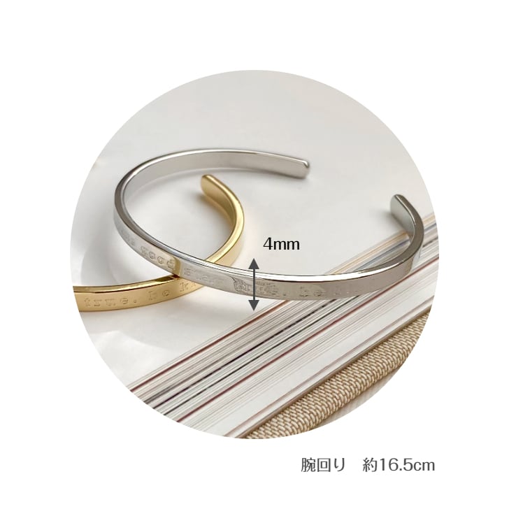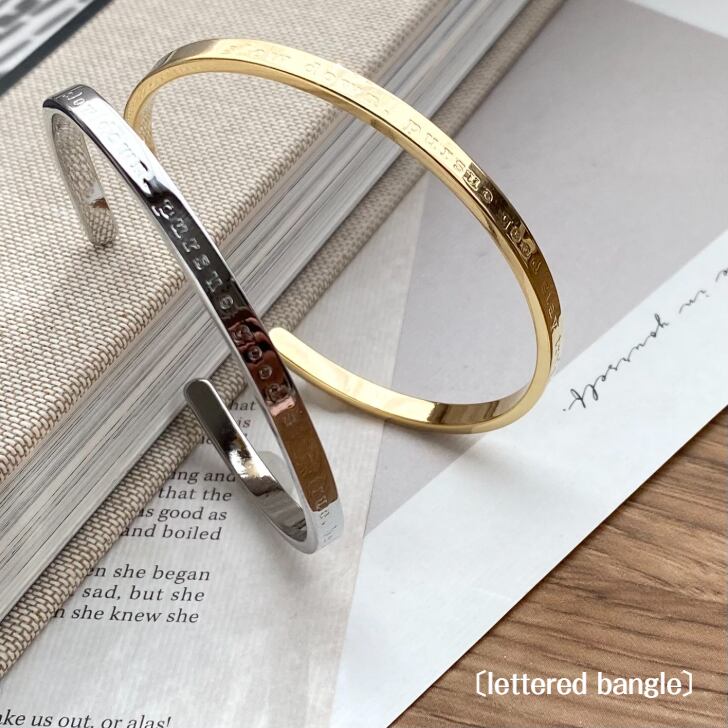シンプルなフォルムにさりげなく刻まれた英字がアクセントになったバングル。