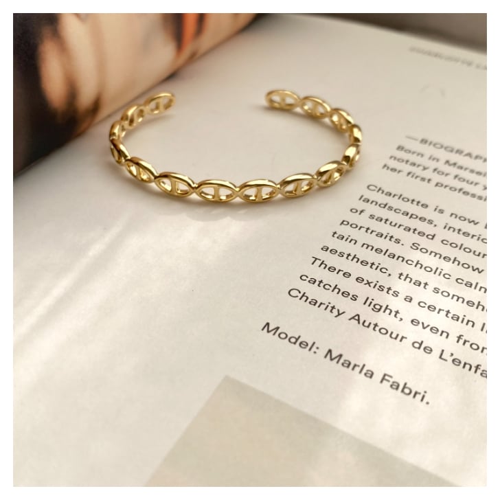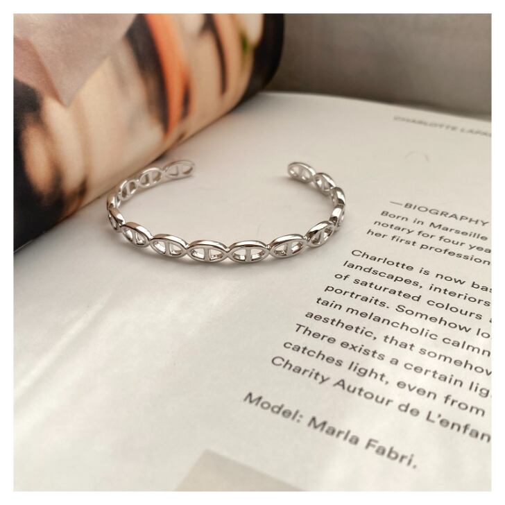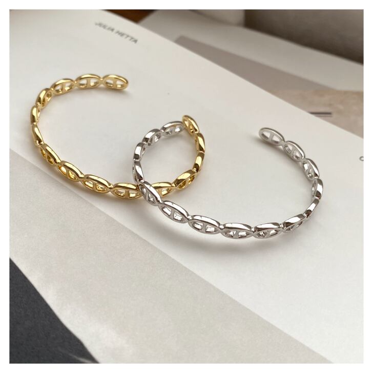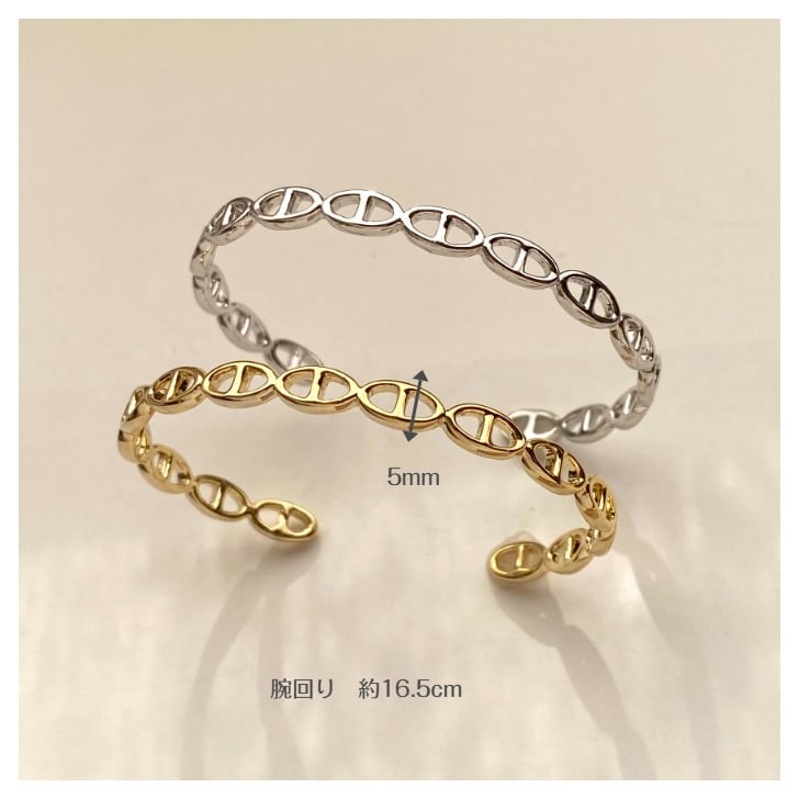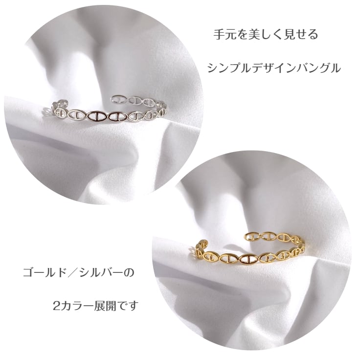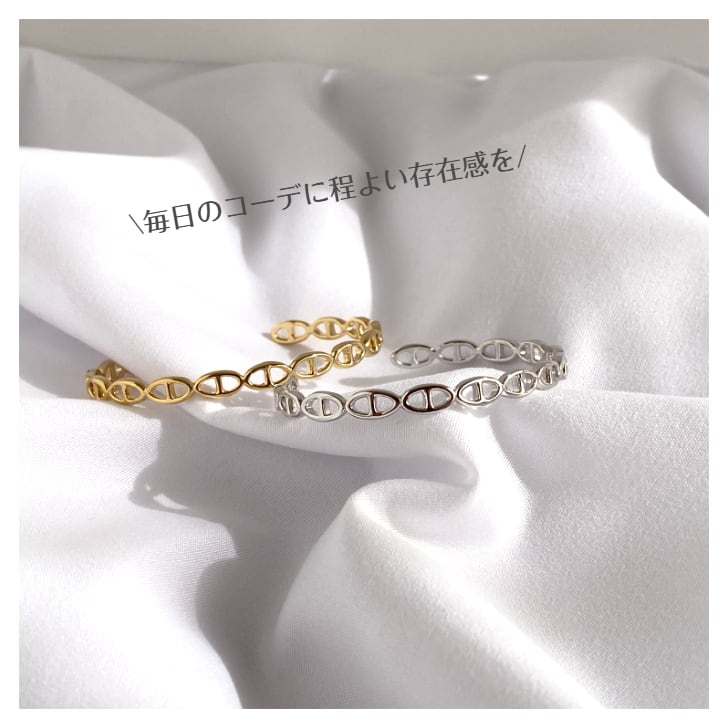 連なるオーバルモチーフが印象的な、上品で洗練されたデザインのバングル。