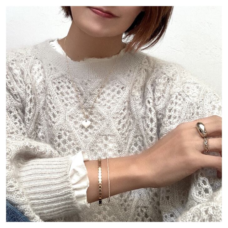シンプルなトップスに合わせるだけで、さりげなく華やかさが生まれます。