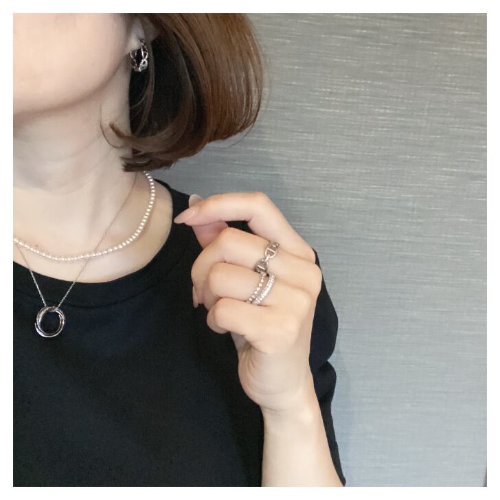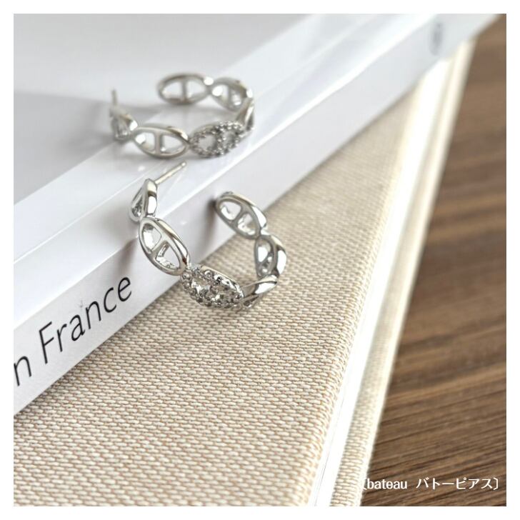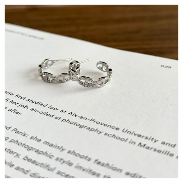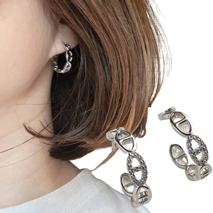 立体的なフォルムと繊細なストーンの輝きが耳元に上品なアクセントを添え、コーディネートをぐっと洗練された印象に仕上げます。